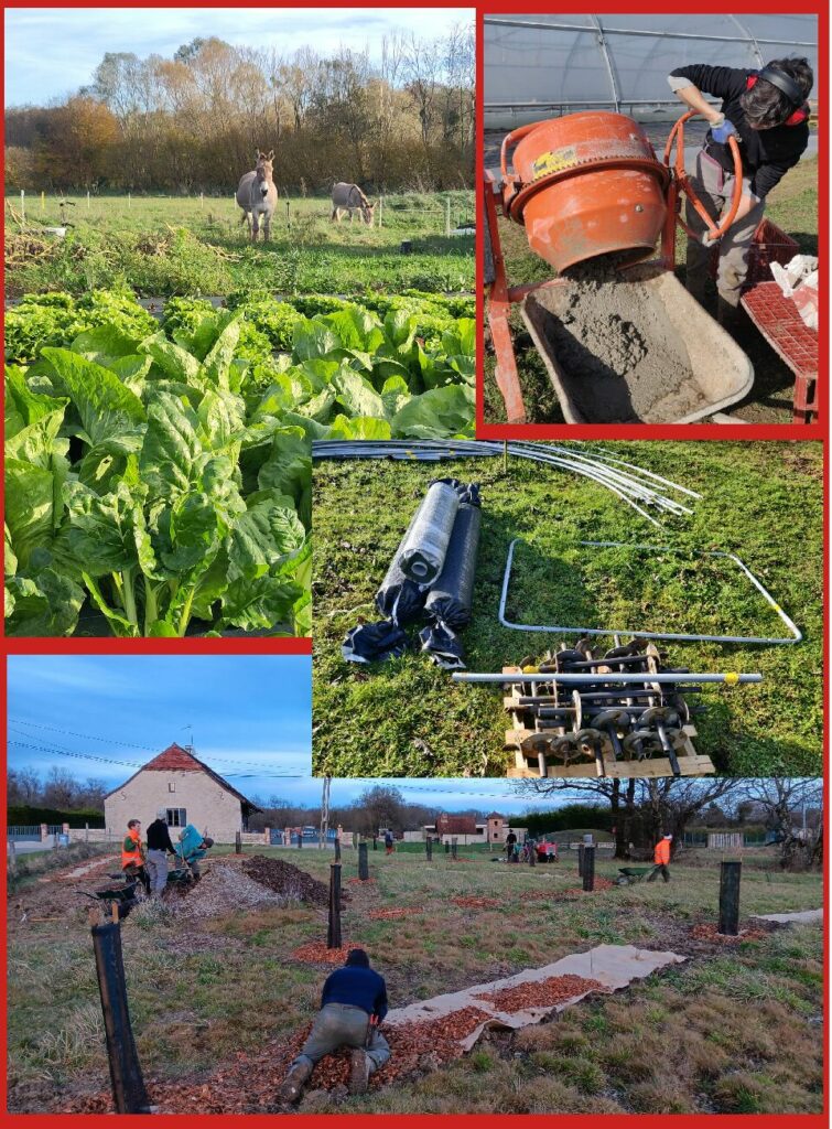 En parallèle des imprévus, on continue les activités : travail au champ, soin des jardins pour la saison à venir (moment parfait pour nourrir la vie du sol !), aménagement des bâtiments, réparation diverses, vente à la ferme, formation continue, réunions, organisation de la saison à venir; on ne s’ennuie pas même quand la nature se repose !